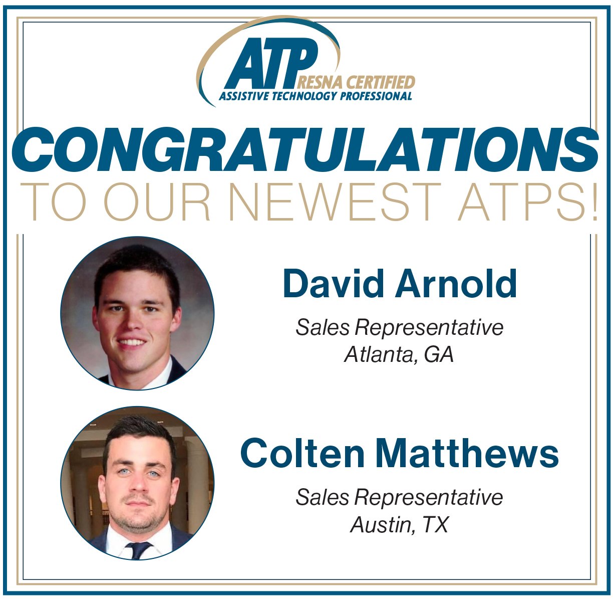 | Latest Certified ATP ProfessionalsCongratulations to David Arnold and Colten Matthews on passing your ATP certification exams! To learn how you can become Rehab Medical's newest ATP, contact Sarah Gegner at sgegner@rehabmedical.com | |