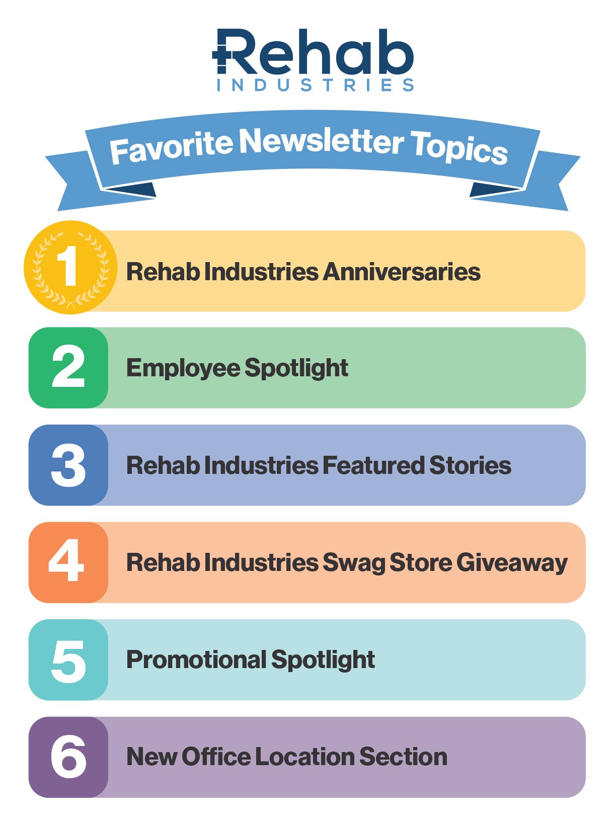 When you participate in our monthly scavenger hunt, you’ll be entered to win a Rehab Industries swag store gift card. Locate the hidden Rehab Industries logo in one of the stories then take the employee survey to submit your answer.
